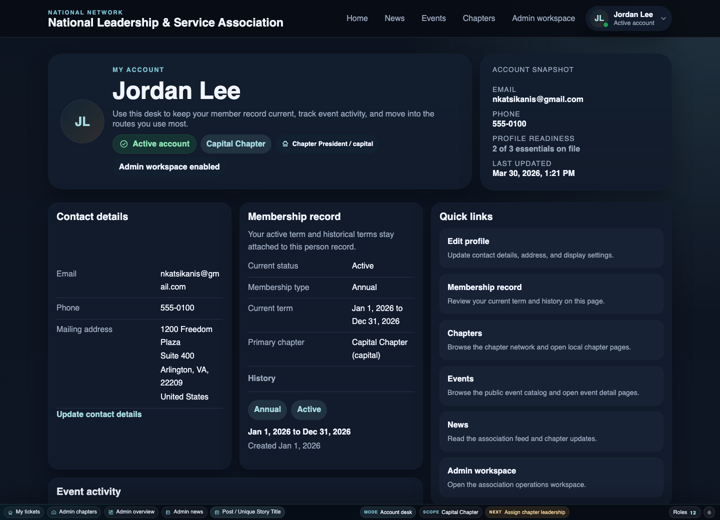 One member record with chapter context, role context, and account state in the same screen.