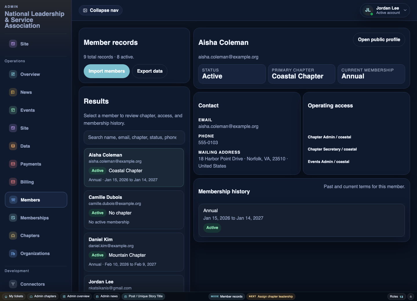 A live directory for member records, chapter relationships, and current status instead of fragmented lists.
