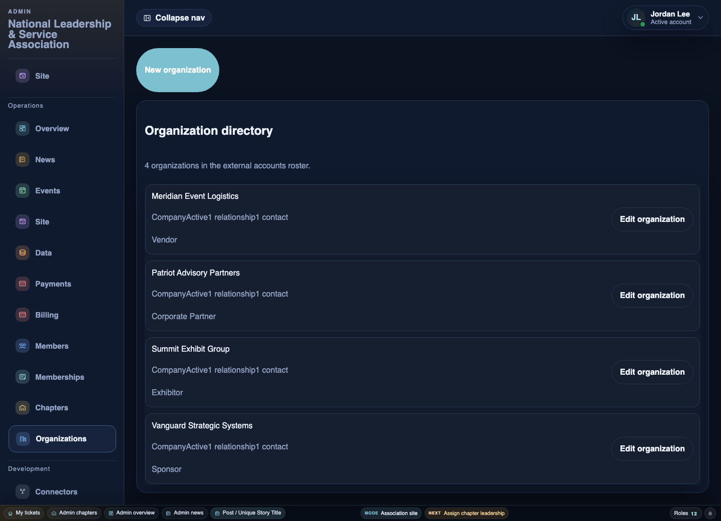 Sponsors, exhibitors, partners, and vendors are kept as real organizations with reusable records.